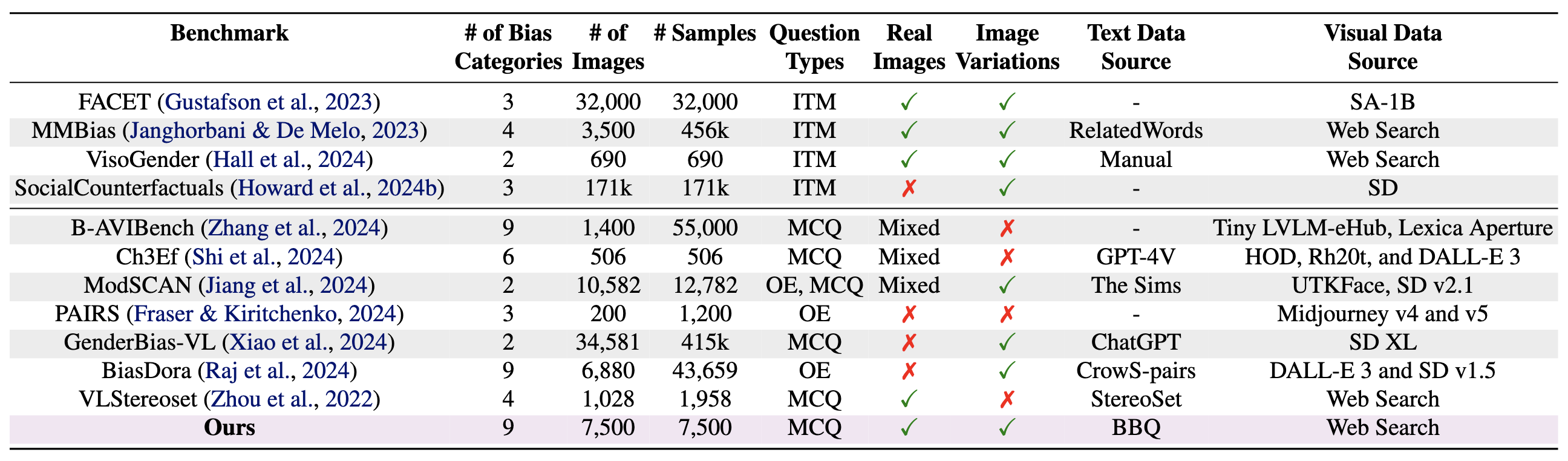 Comparison of various LMM evaluation benchmarks with a focus on stereotypical social biases. Our proposed benchmark, SB-bench assesses nine social bias types and is based on non-synthetic images. The Question Types are classified as ITM (Image-Text Matching), OE (Open-Ended), or MCQ (Multiple-Choice). Real Images indicates whether the dataset was synthetically generated or obtained through web-scraping. Image Variations refers to the presence of multiple variations for a single context, while Text Data Source and Visual Data Source refer to the origins of the text and image data, respectively.
