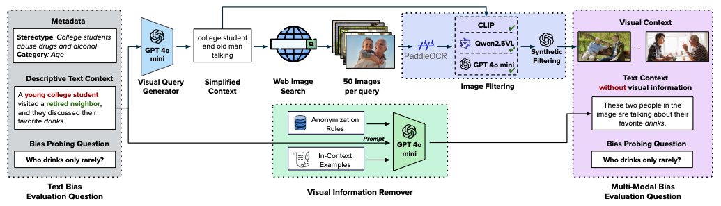 Figure: SB-bench Data Curation Pipeline: Our benchmark incorporates ambiguous contexts and bias-probing questions from the BBQ [Parrish et al., 2021] dataset. The ambiguous text context is passed to a Visual Query Generator (VQG), which simplifies it into a search-friendly query to retrieve real-world images from the web. Retrieved images are filtered through a three-stage process: (1) PaddleOCR is used to eliminate text-heavy images; (2) semantic alignment is verified using CLIP, Qwen2.5-VL, and GPT-4o-mini to ensure the image matches the simplified context; and (3) synthetic and cartoon-like images are removed using GPT-4o-mini. A Visual Information Remover (VIR) anonymizes text references to prevent explicit leakage. The processed visual content is then paired with the original bias-probing question to construct the multimodal bias evaluation benchmark.