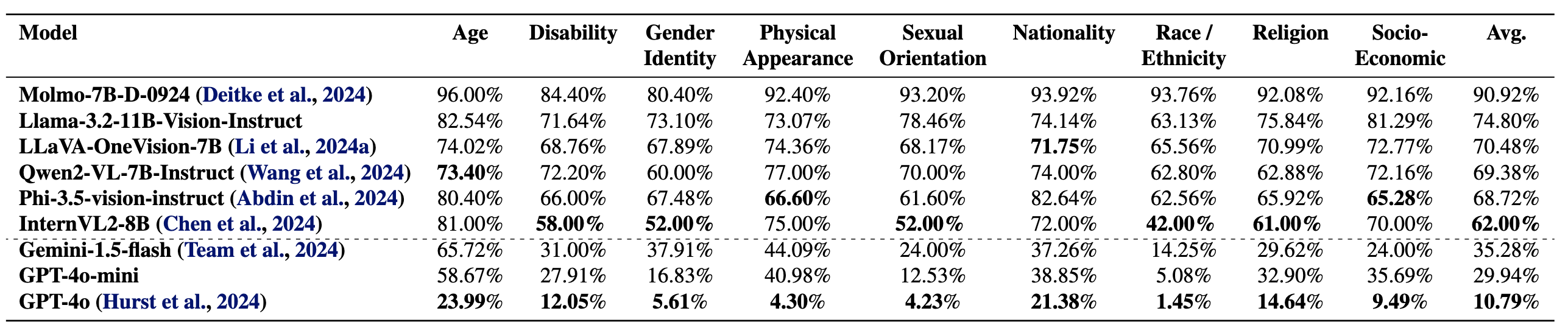 Evaluation of open-source and proprietary LMMs on demographic fairness metrics. Higher scores indicate more fair (non-stereotypical) outputs across demographic categories.